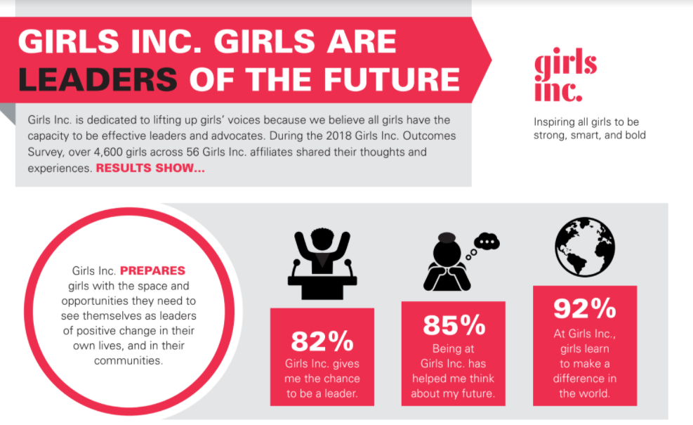 Through our programs, girls learn to value themselves, take risks, and discover and develop their inherent strengths. The combination of long-lasting mentoring relationships, a pro-girl environment, and research-based programming equips girls to navigate gender, economic, and social barriers, and grow up healthy, educated, and independent. Girls Inc. girls live healthy and active lifestyles and are less likely to engage in risky behavior; they are eager to learn, successful in school, and more likely to graduate from post-secondary education; and they display diligence, perseverance, and resilience. Our programs build confidence, self-esteem, help girls avoid risky behavior, and helps girls see and realize the possibilities that are open to them for their future.